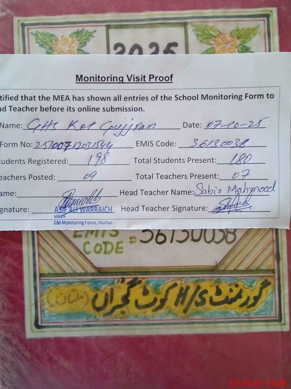 | EMIS Code: 36130038 | Name of School: GHS KOT GUJRAN MULTAN | |||