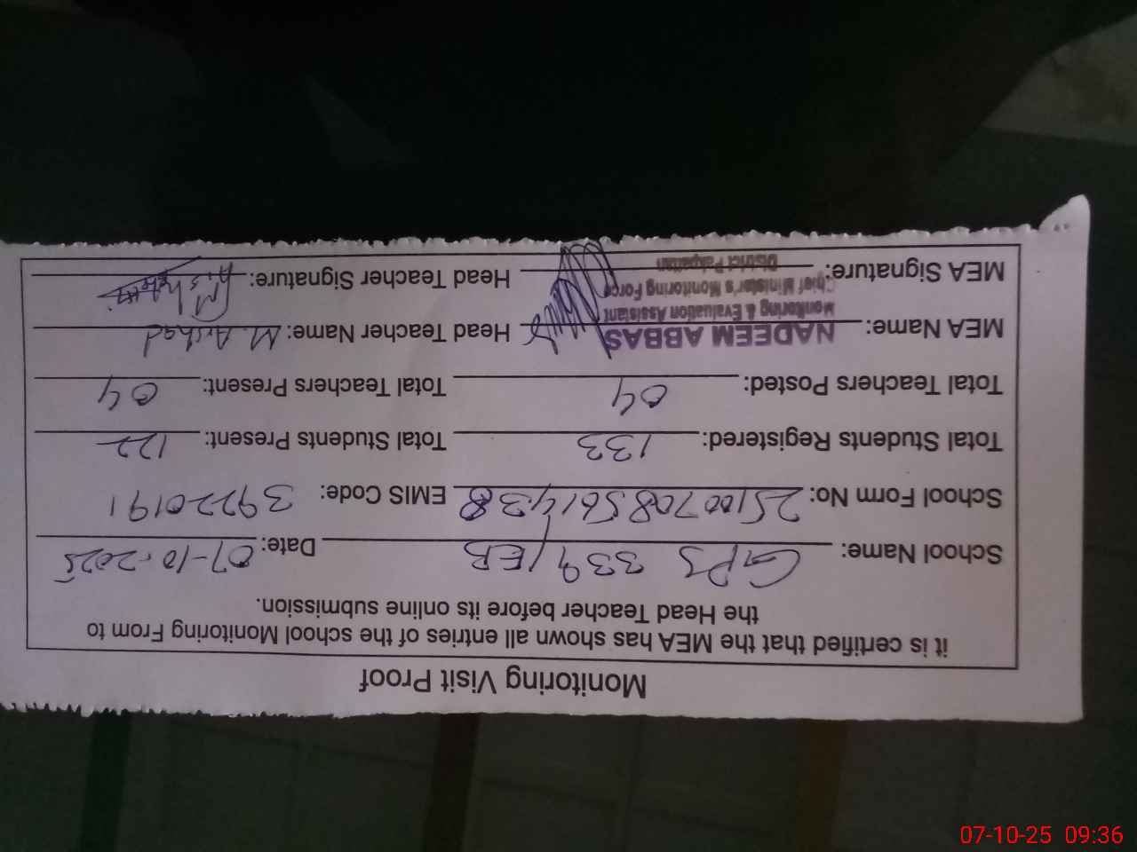 | Monitoring Date: 07-10-2025 | Start Time: 07-10-2025 08:56 AM | End Time: 07-10-2025 09:37 AM | Name of MEA: NA**** AB**** | |
