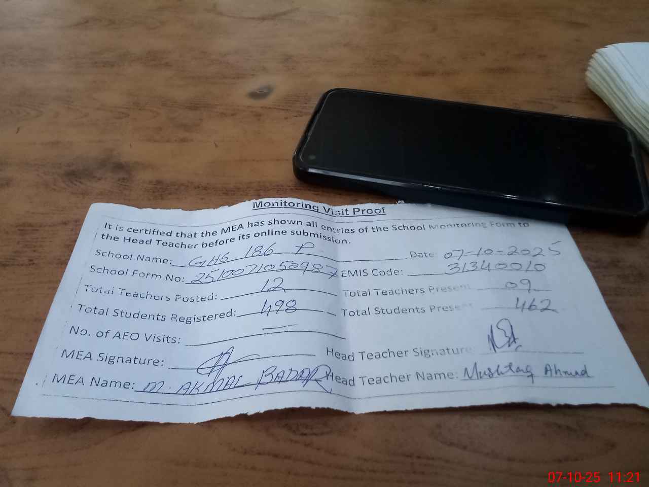 | Attendance Register | Head Teacher | MEA with School | Visit Proof |
