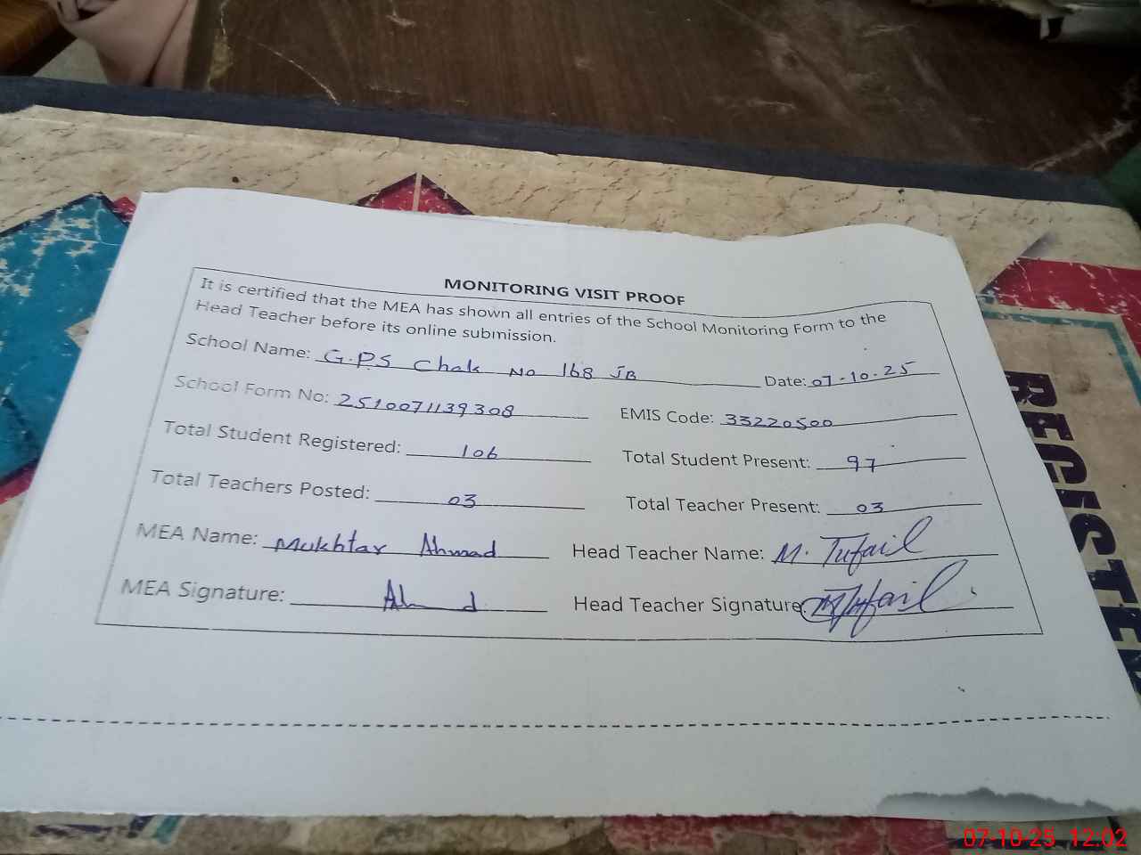 | EMIS Code: 33220500 | Name of School: GPS CHAK NO 168 JB | |||