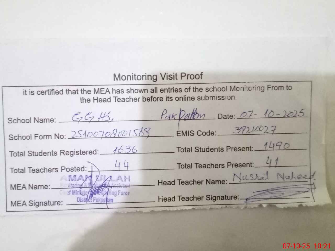 | Monitoring Date: 07-10-2025 | Start Time: 07-10-2025 08:00 AM | End Time: 07-10-2025 10:22 AM | Name of MEA: AM**** UL**** | |