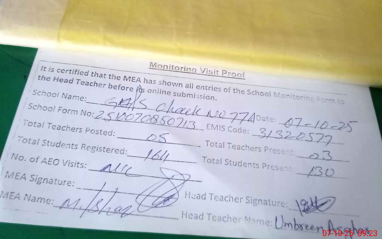 | EMIS Code: 31320577 | Name of School: GMPS CHAK 77/A | |||
