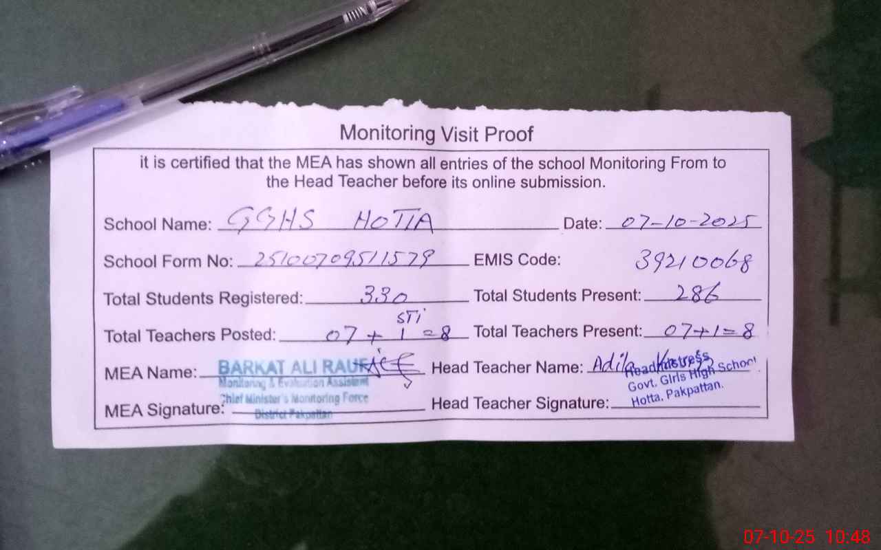 | Certified that this School was Inspected by the Undersigned MEA/DMO Today and the Information Stated Above is as Per Record. | |||||