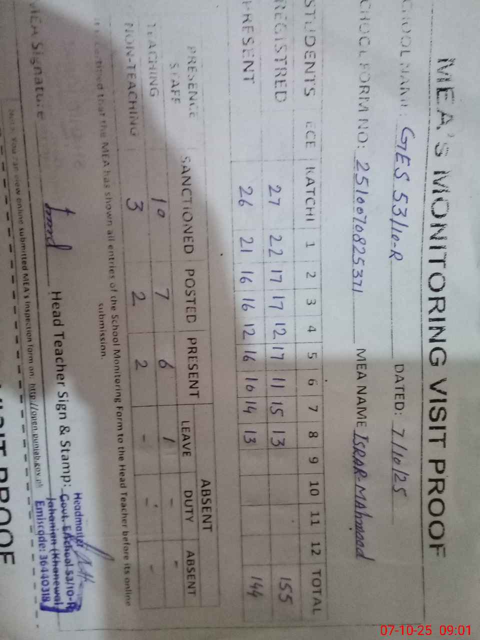 | Certified that this School was Inspected by the Undersigned MEA/DMO Today and the Information Stated Above is as Per Record. | |||||