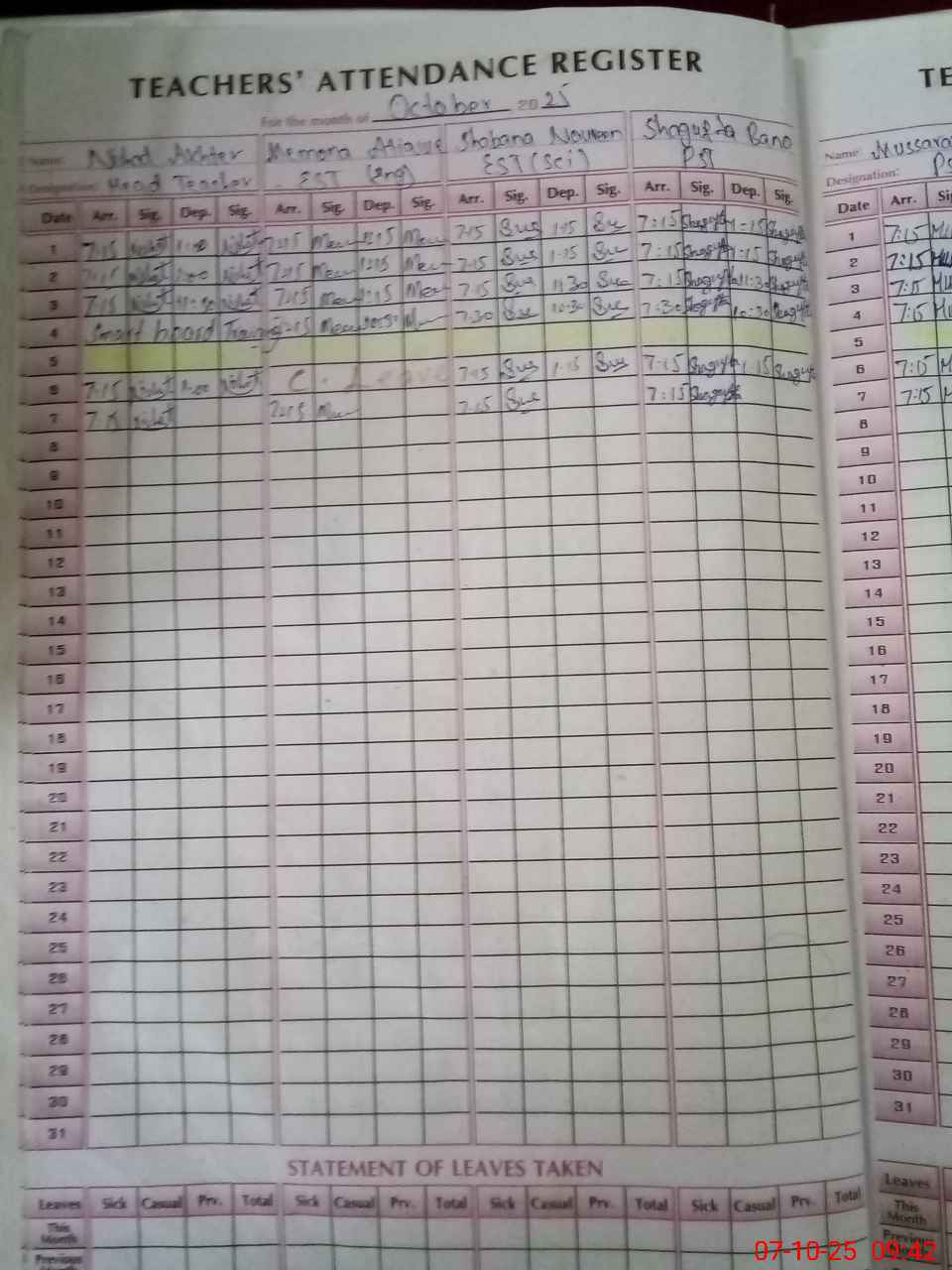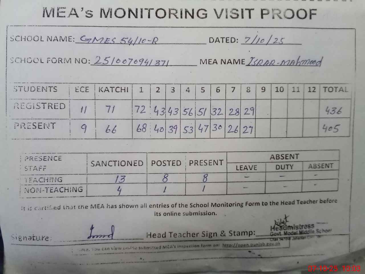 | Attendance Register | Head Teacher | MEA with School | Visit Proof |