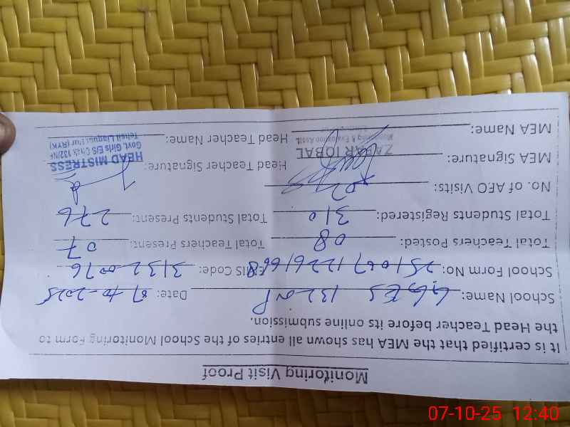 | Monitoring Date: 07-10-2025 | Start Time: 07-10-2025 12:26 PM | End Time: 07-10-2025 12:42 PM | Name of MEA: Za**** Iq**** | |