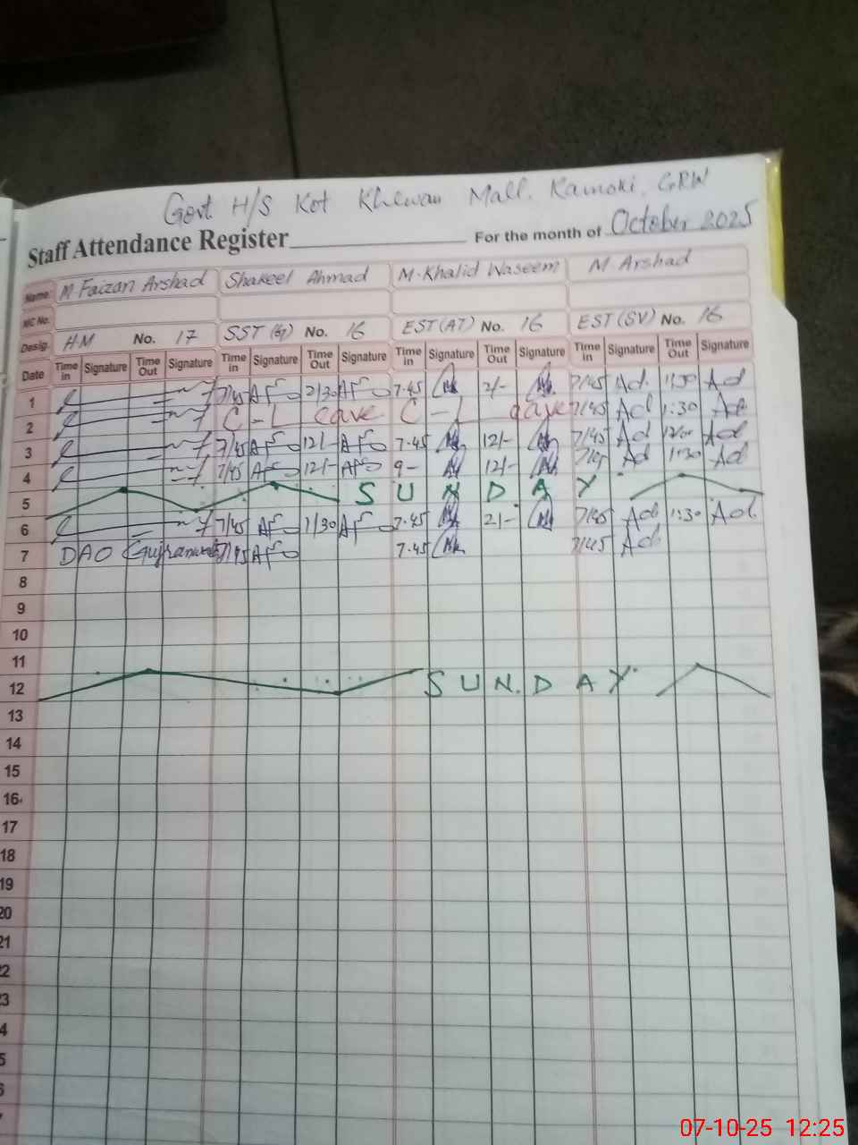 | CNIC | Full Name | Designation | R/C | Absence during last cal. month |