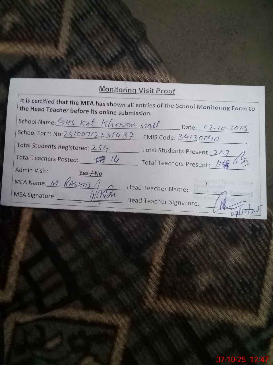 | Attendance Register | Head Teacher | MEA with School | Visit Proof |