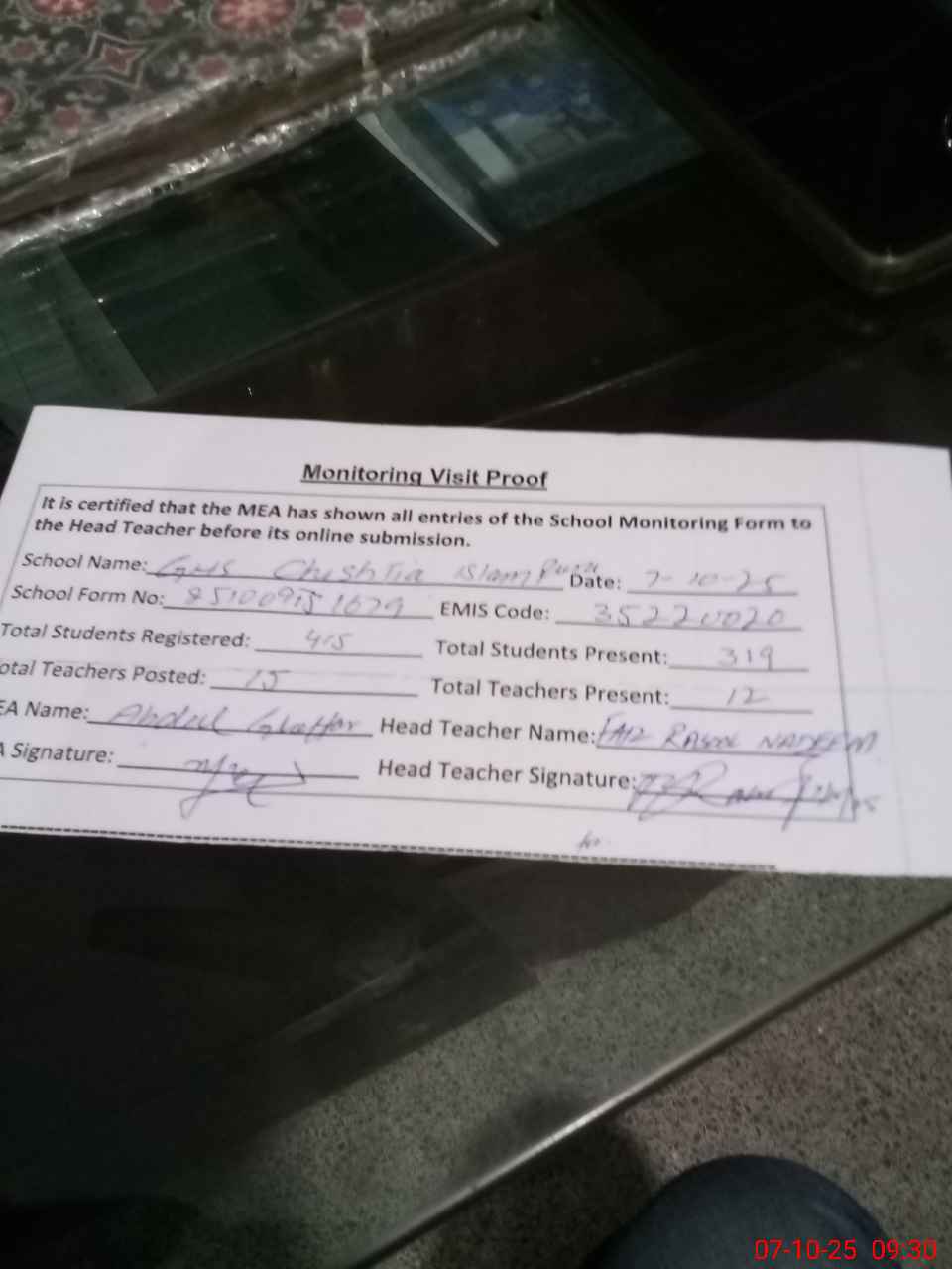 | EMIS Code: 35220020 | Name of School: GHS CHISHTIA ISLAM PURA LAHORE CITY | |||