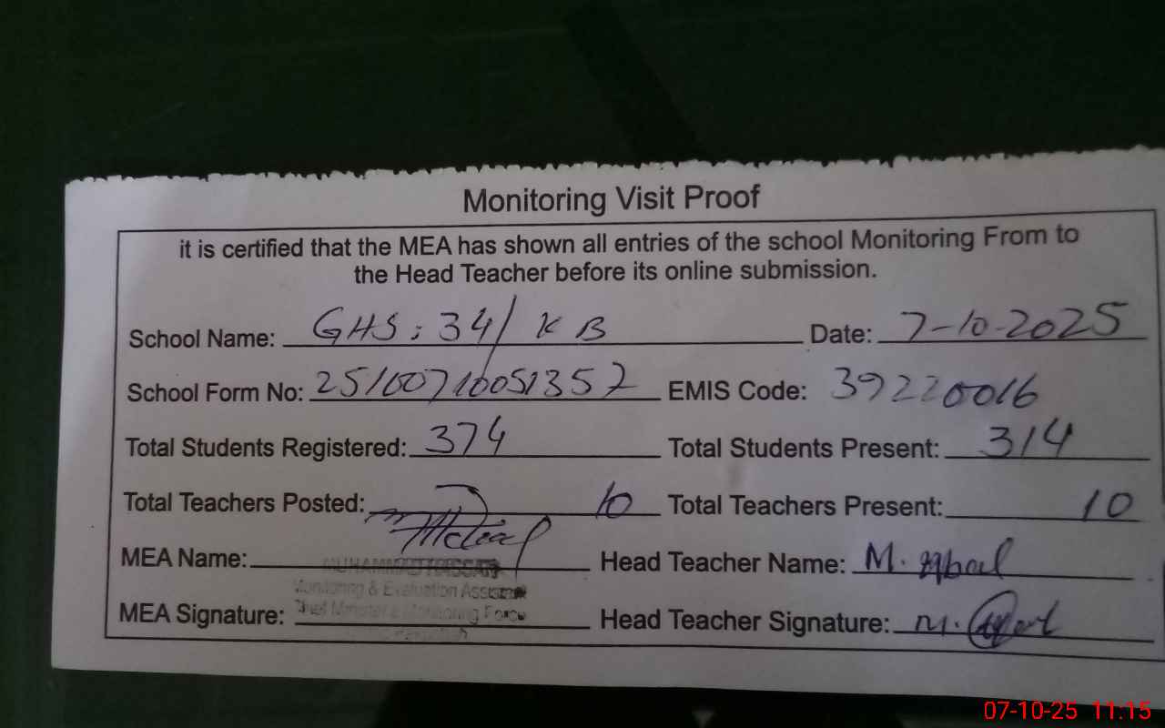 | EMIS Code: 39220016 | Name of School: GHS CHAK NO.34/KB | |||