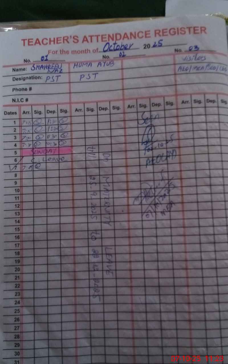 | Name: SH**** NA**** Designation: (School Headmaster's/Headmistress's) PST Phone/Cell Number: 03**** |
