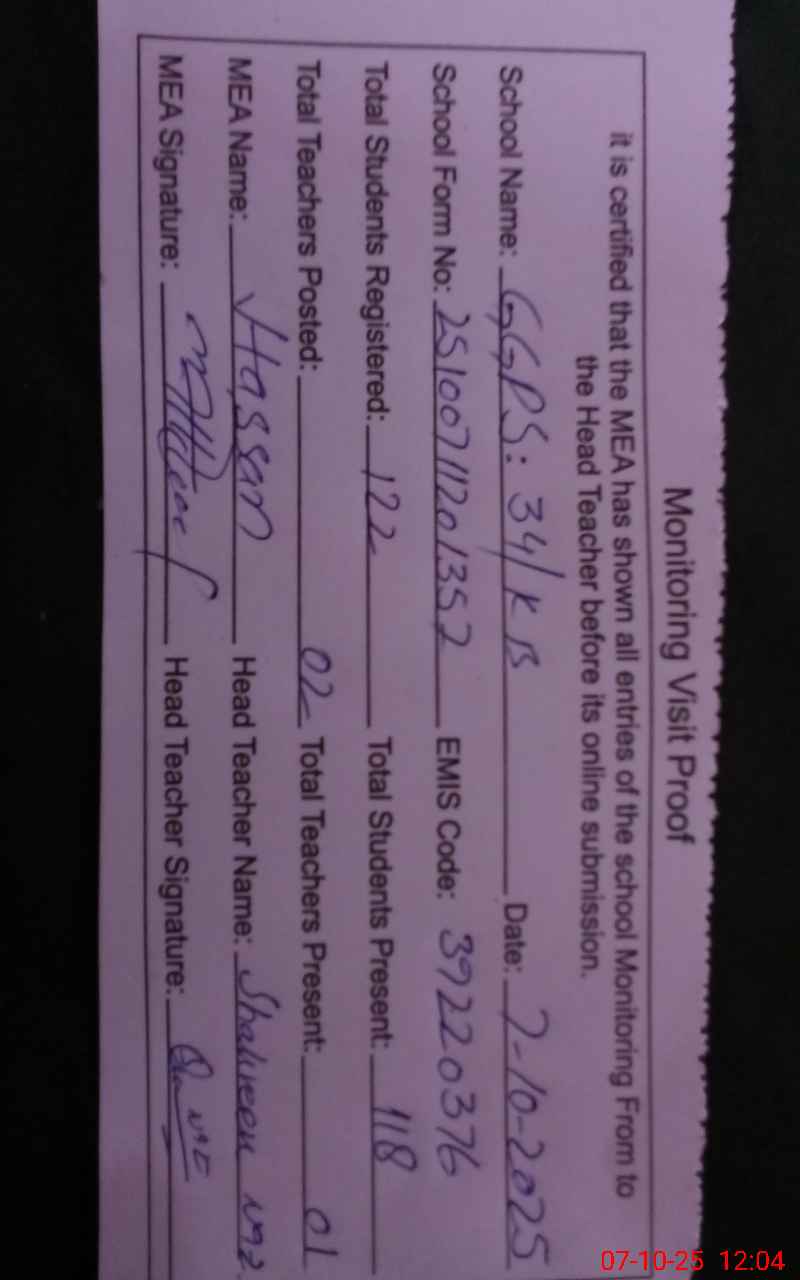 | EMIS Code: 39220376 | Name of School: GGPS 34 KB | |||