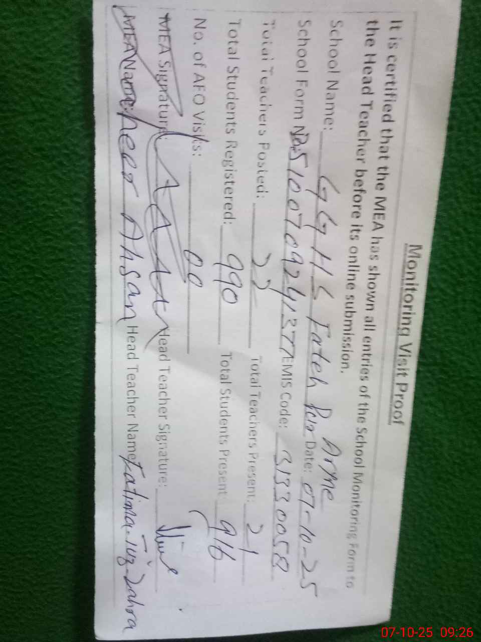 | Monitoring Date: 07-10-2025 | Start Time: 07-10-2025 08:00 AM | End Time: 07-10-2025 09:38 AM | Name of MEA: Za**** Ah**** | |