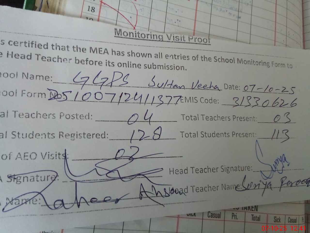 | Monitoring Date: 07-10-2025 | Start Time: 07-10-2025 11:48 AM | End Time: 07-10-2025 12:44 PM | Name of MEA: Za**** Ah**** | |