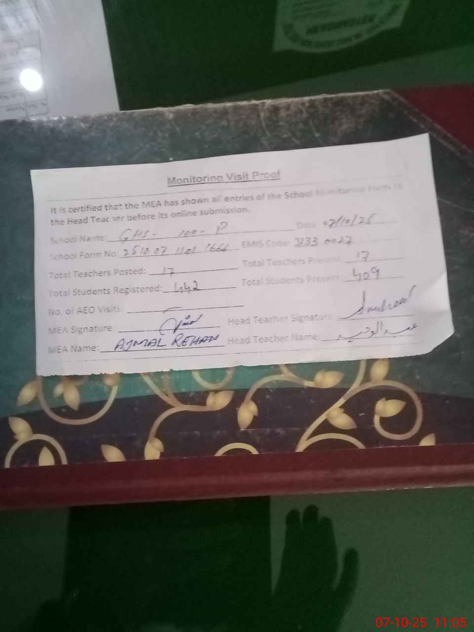 | Attendance Register | Head Teacher | MEA with School | Visit Proof |