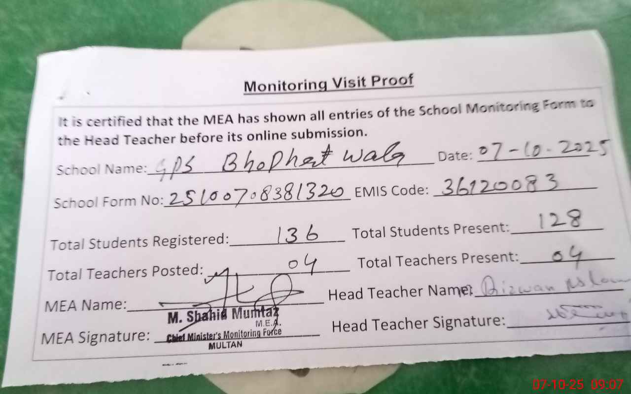 | Monitoring Date: 07-10-2025 | Start Time: 07-10-2025 08:38 AM | End Time: 07-10-2025 09:11 AM | Name of MEA: MU**** SH**** MU**** | |