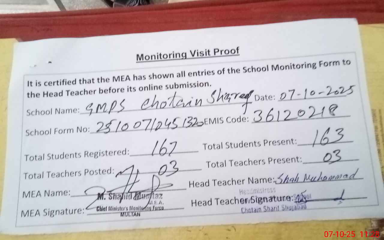 | EMIS Code: 36120218 | Name of School: GMPS CHOTAIN SHARIF | |||