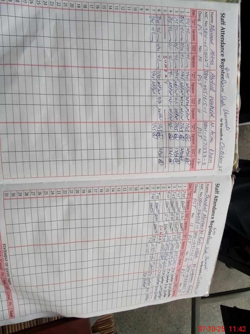| CNIC | Full Name | Designation | R/C | Absence During Last Calender Month |