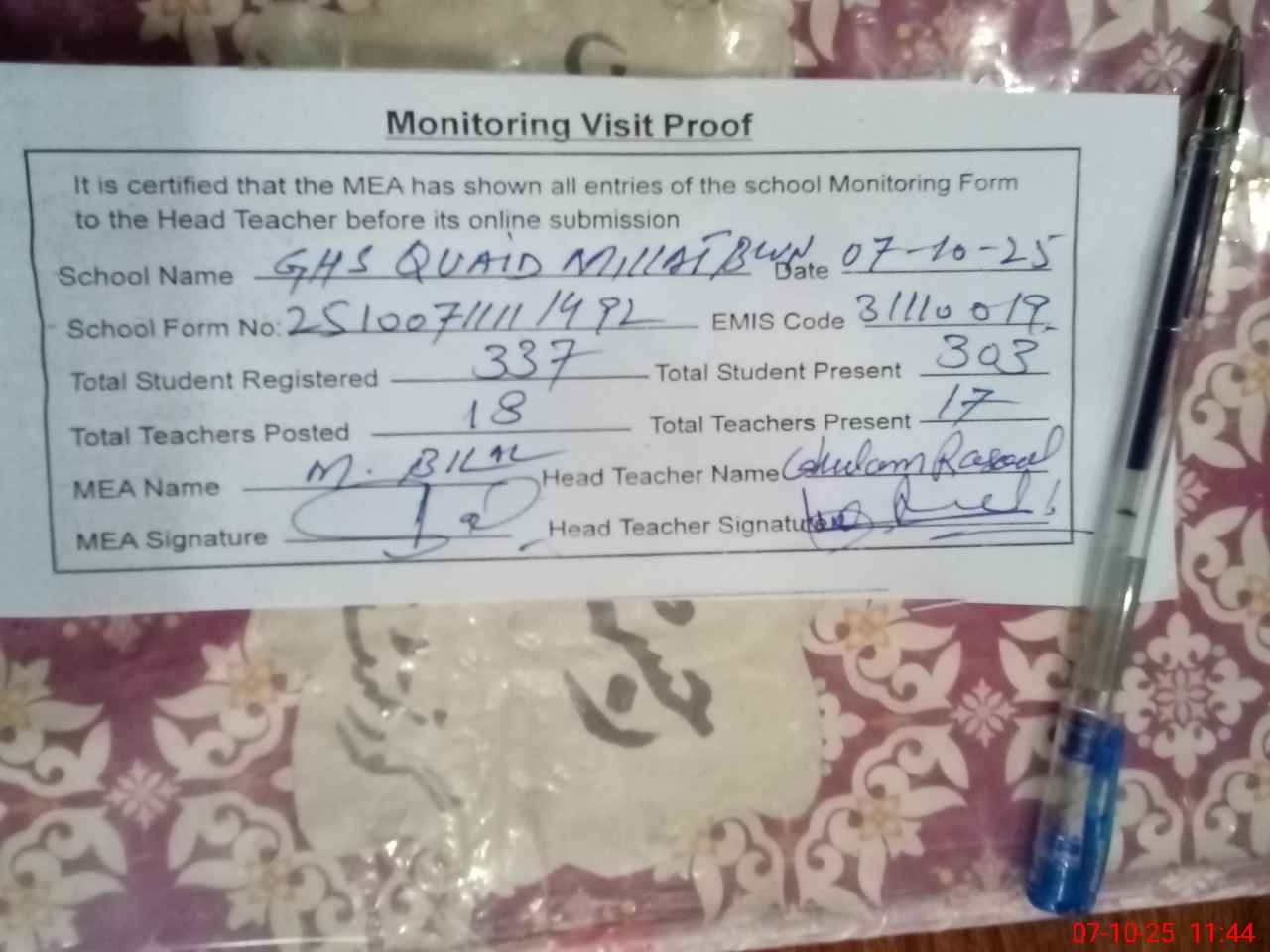 | Certified that this School was Inspected by the Undersigned MEA/DMO Today and the Information Stated Above is as Per Record. | |||||