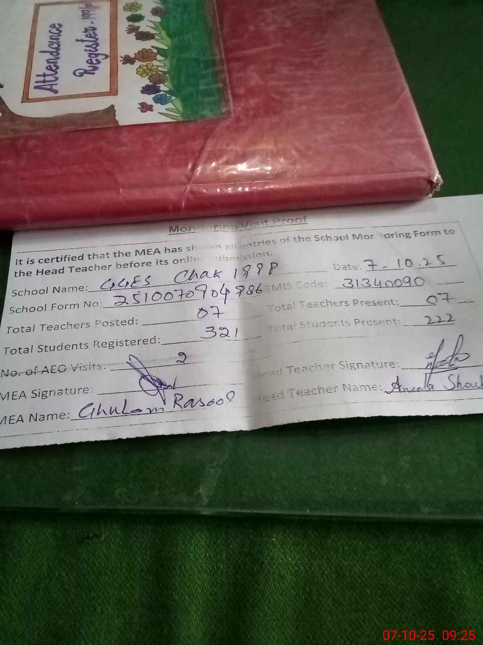 | Attendance Register | Head Teacher | MEA with School | Visit Proof |