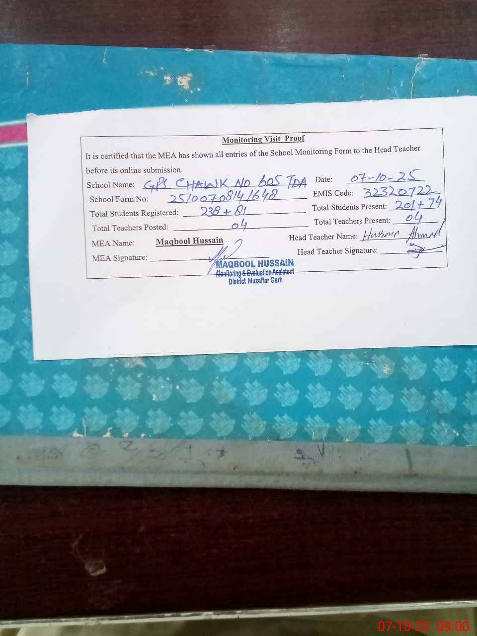| Attendance Register | Head Teacher | MEA with School | Visit Proof |