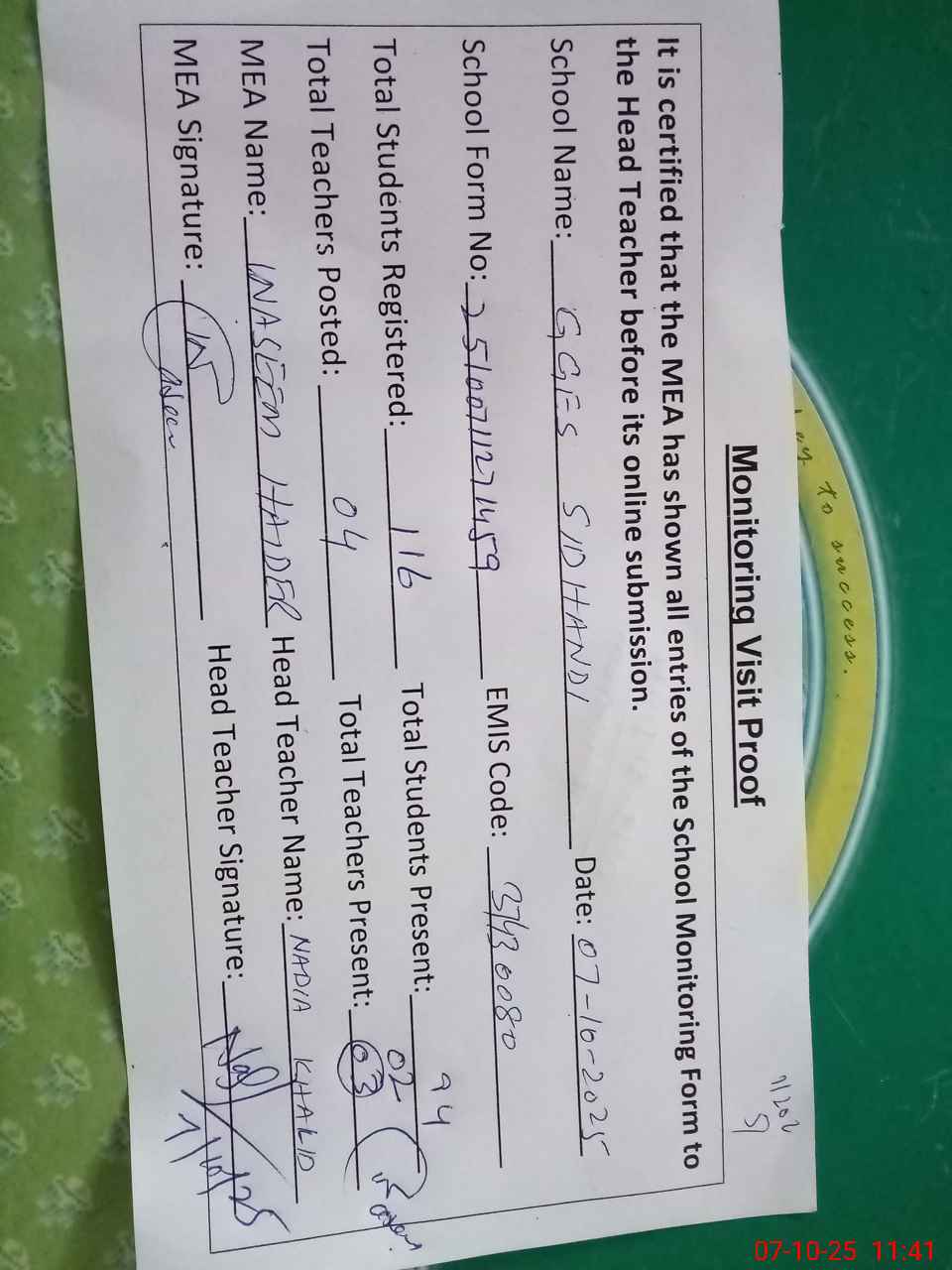 | Attendance Register | Head Teacher | MEA with School | Visit Proof |