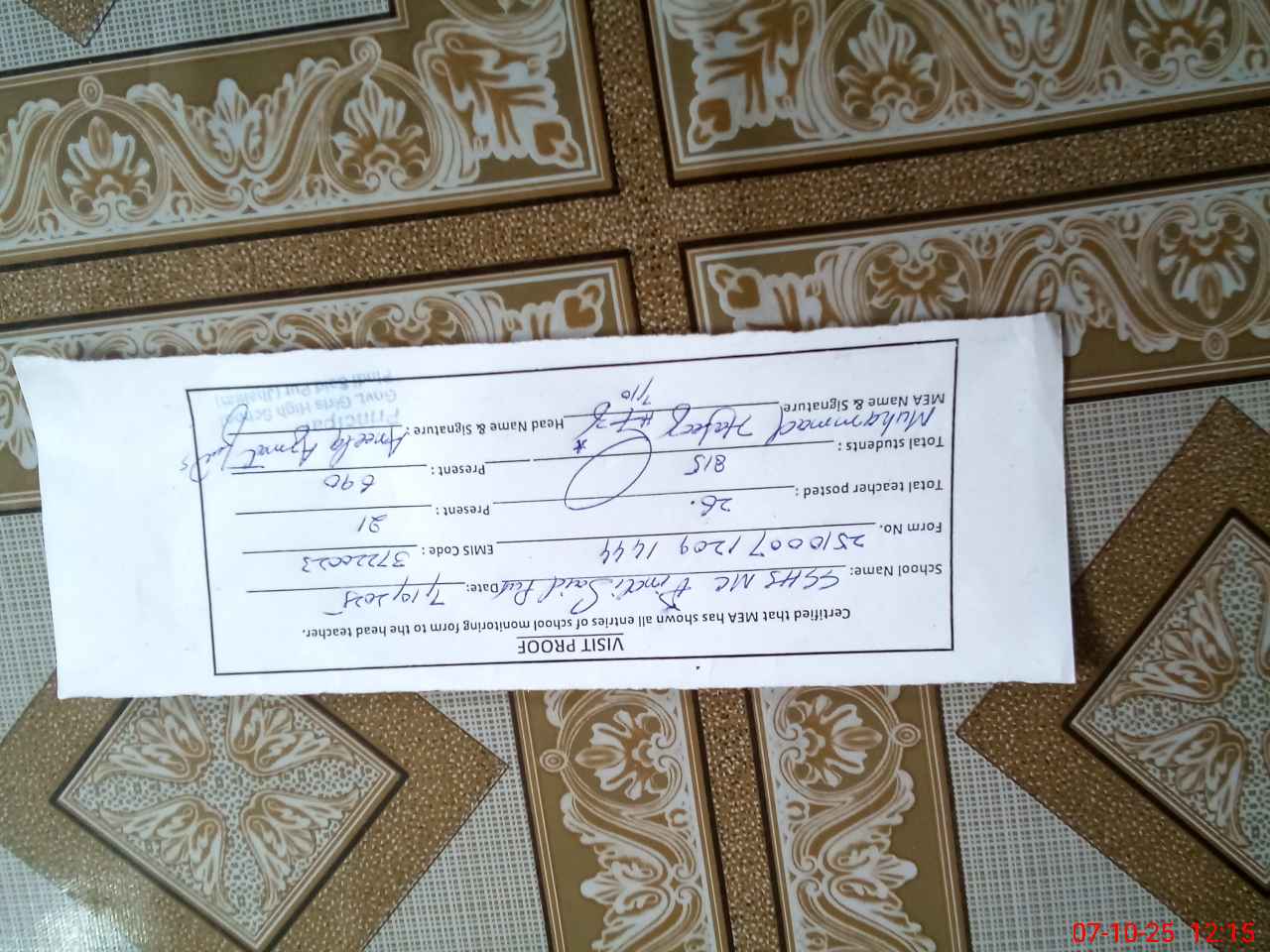 | Certified that this School was Inspected by the Undersigned MEA/DMO Today and the Information Stated Above is as Per Record. | |||||