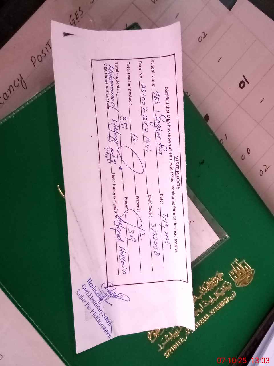 | Attendance Register | Head Teacher | MEA with School | Visit Proof |