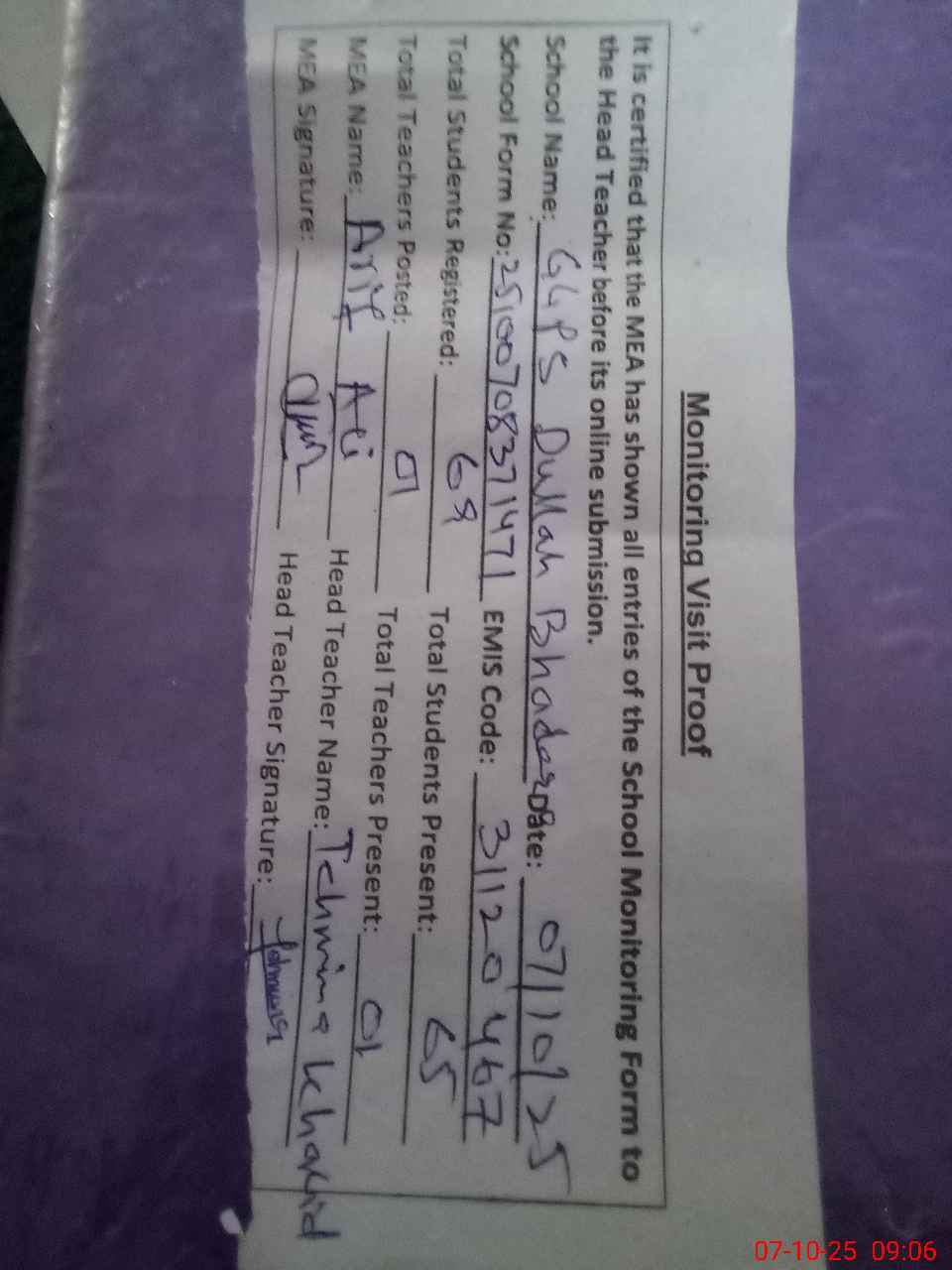 | Attendance Register | Head Teacher | MEA with School | Visit Proof |