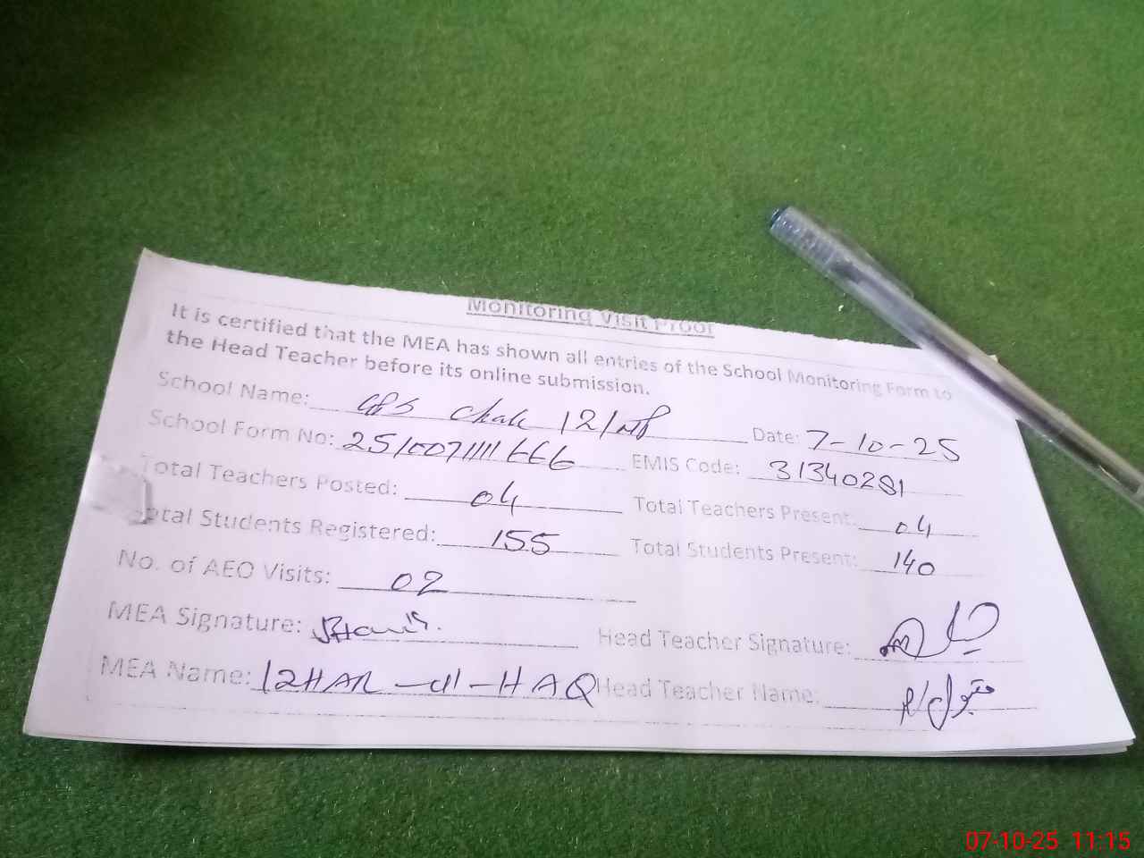 | EMIS Code: 31340281 | Name of School: GPS CHAK NO 12 NP | |||