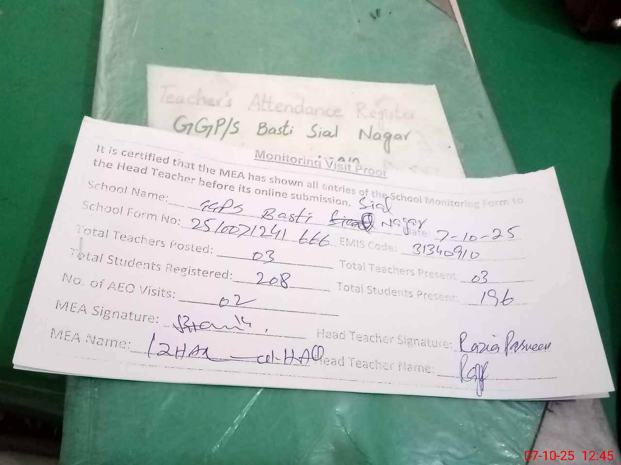 | Attendance Register | Head Teacher | MEA with School | Visit Proof |