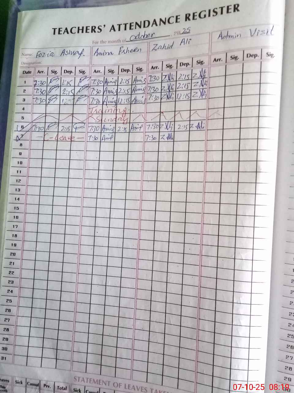 | Remarks (Use Separate Page if Required): School have two saprit building and both are in use PST FIZIA ASHRAF IS ABSENT FROM SCHOOL NO LEAVE RECORD NSB AND FTF RECORD NOT SHOW DUE TO HEAD TEACHER ARE ABSENT FROM SCHOOL | |||||
