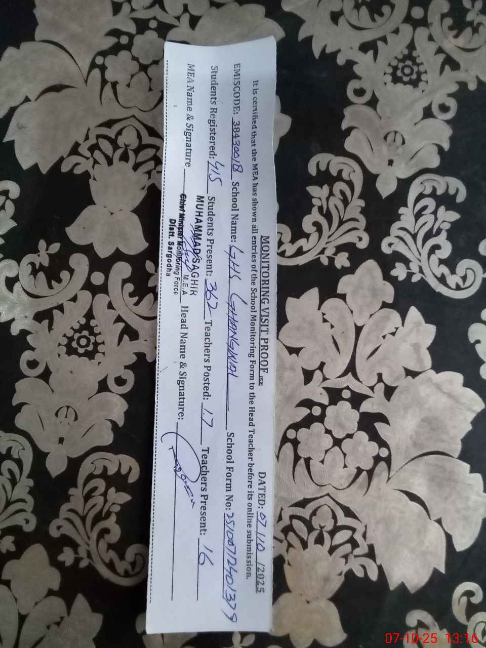 | Certified that this School was Inspected by the Undersigned MEA/DMO Today and the Information Stated Above is as Per Record. | |||||