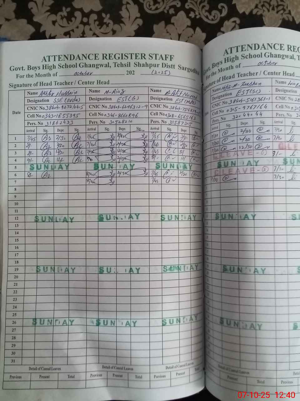 | CNIC | Full Name | Designation | R/C | Absence during last cal. month |