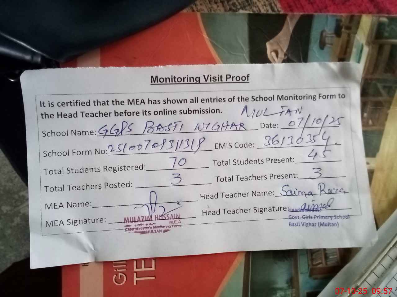 | EMIS Code: 36130354 | Name of School: GGPS BASTI WIGHAR BOSAN HITTAR P.BOX MULTAN | |||