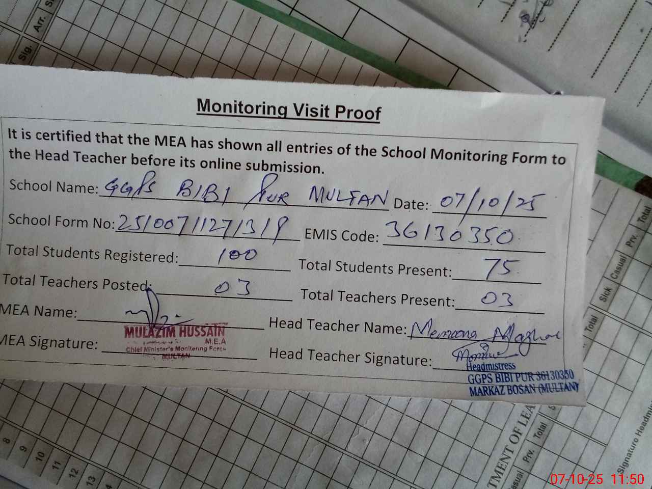| Attendance Register | Head Teacher | MEA with School | Visit Proof |