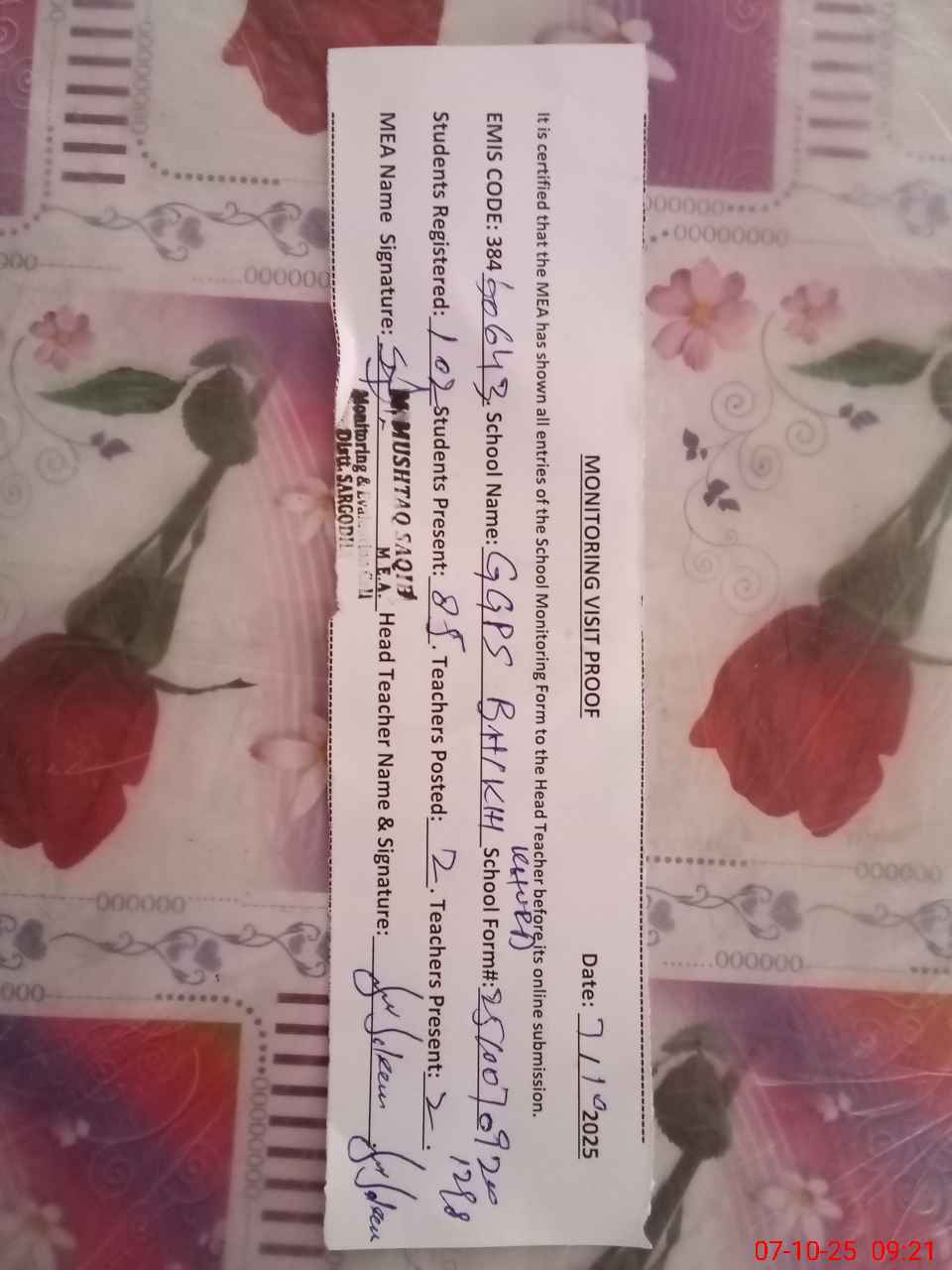 | Certified that this School was Inspected by the Undersigned MEA/DMO Today and the Information Stated Above is as Per Record. | |||||