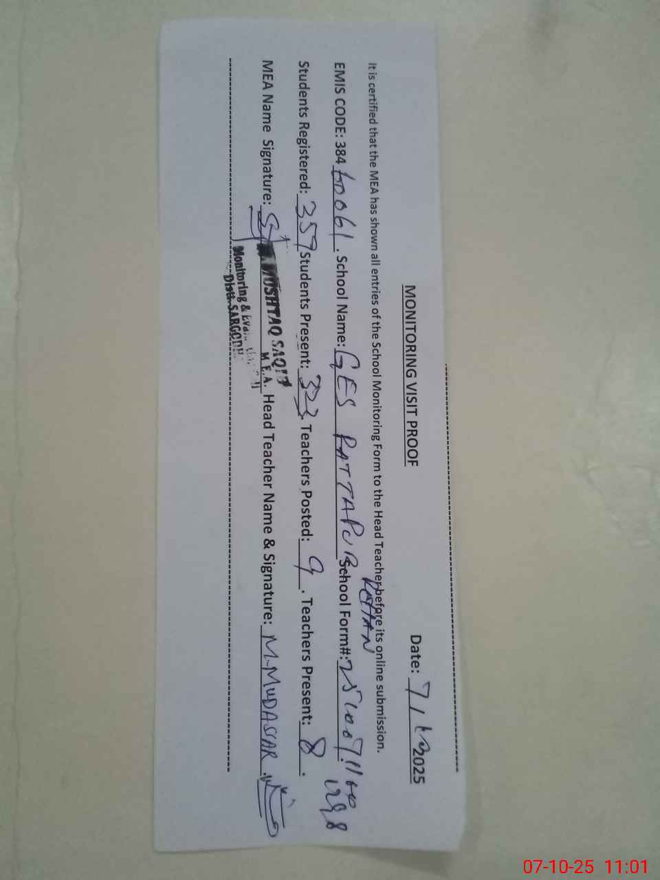 | Attendance Register | Head Teacher | MEA with School | Visit Proof |