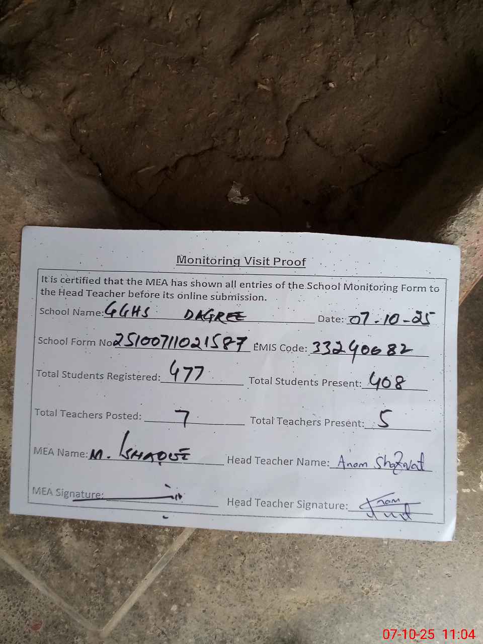 | Attendance Register | Head Teacher | MEA with School | Visit Proof |