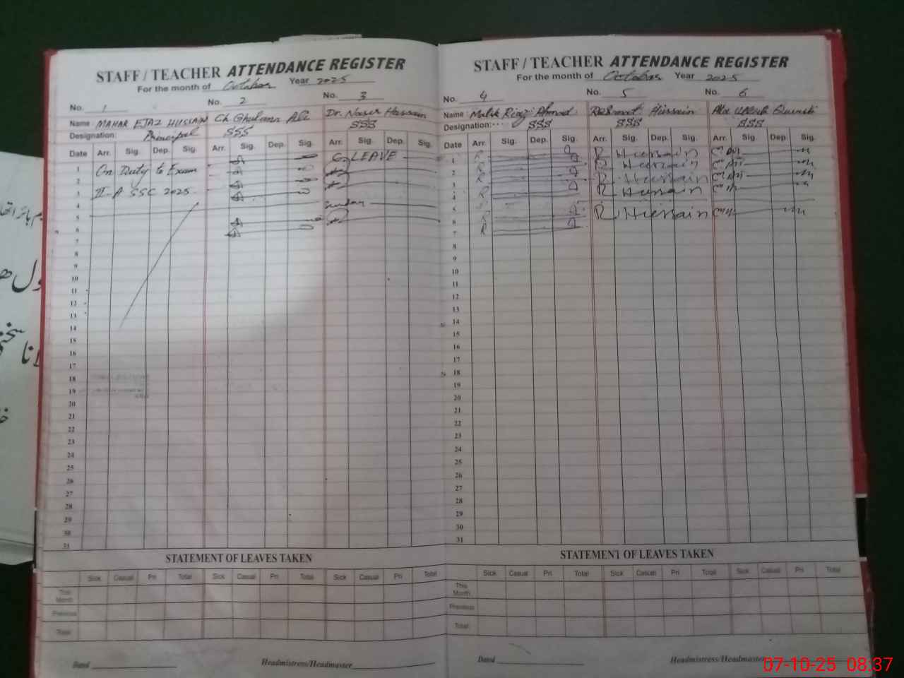 | Remarks (Use Separate Page if Required): SST ATTA ULLAH QURAISHI ARRIVED AT 0832 AM SSS REHMAT HUSSAIN ARRIVED AT 0900 AM SO AS PER SOP MARKED ABSENT SSS MUHAMMAD SHARIF MARKED ON ADMINISTRATOR DUTY BUT DUTY ORDERS NOT AVAILABLE SO MARKED ABSENT STUDENTS ATTENDENCE LIST OF PREVIOUS SESSION | |||||