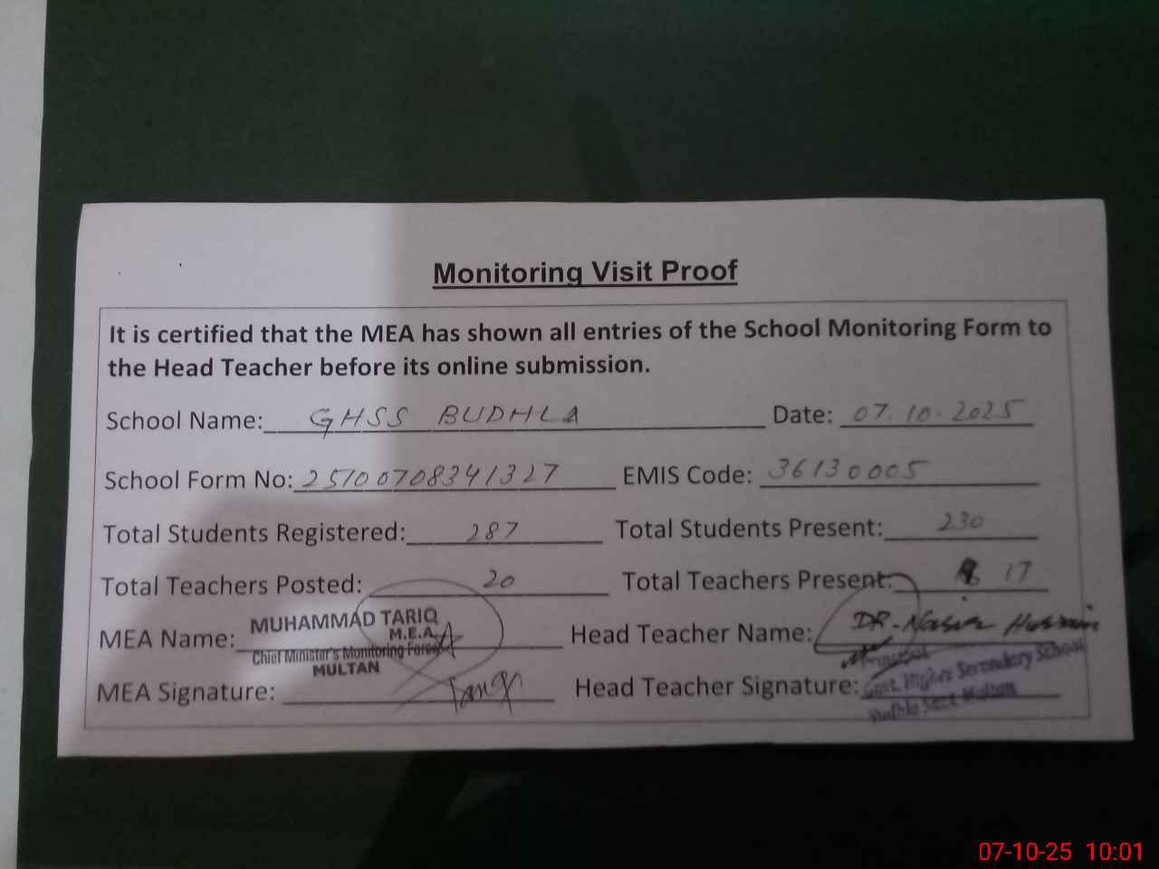 | Certified that this School was Inspected by the Undersigned MEA/DMO Today and the Information Stated Above is as Per Record. | |||||