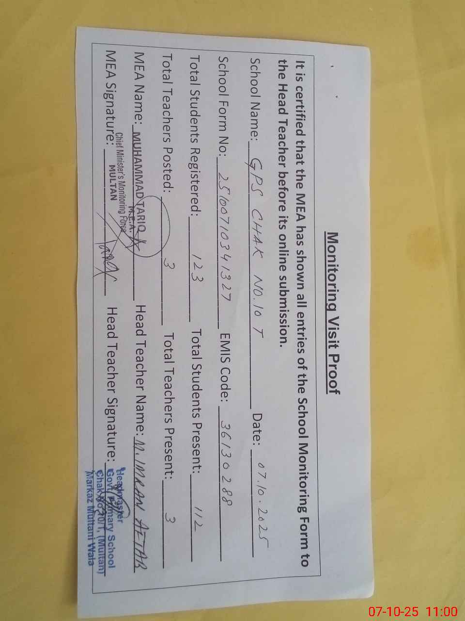 | Monitoring Date: 07-10-2025 | Start Time: 07-10-2025 10:34 AM | End Time: 07-10-2025 11:09 AM | Name of MEA: MU**** TA**** | |