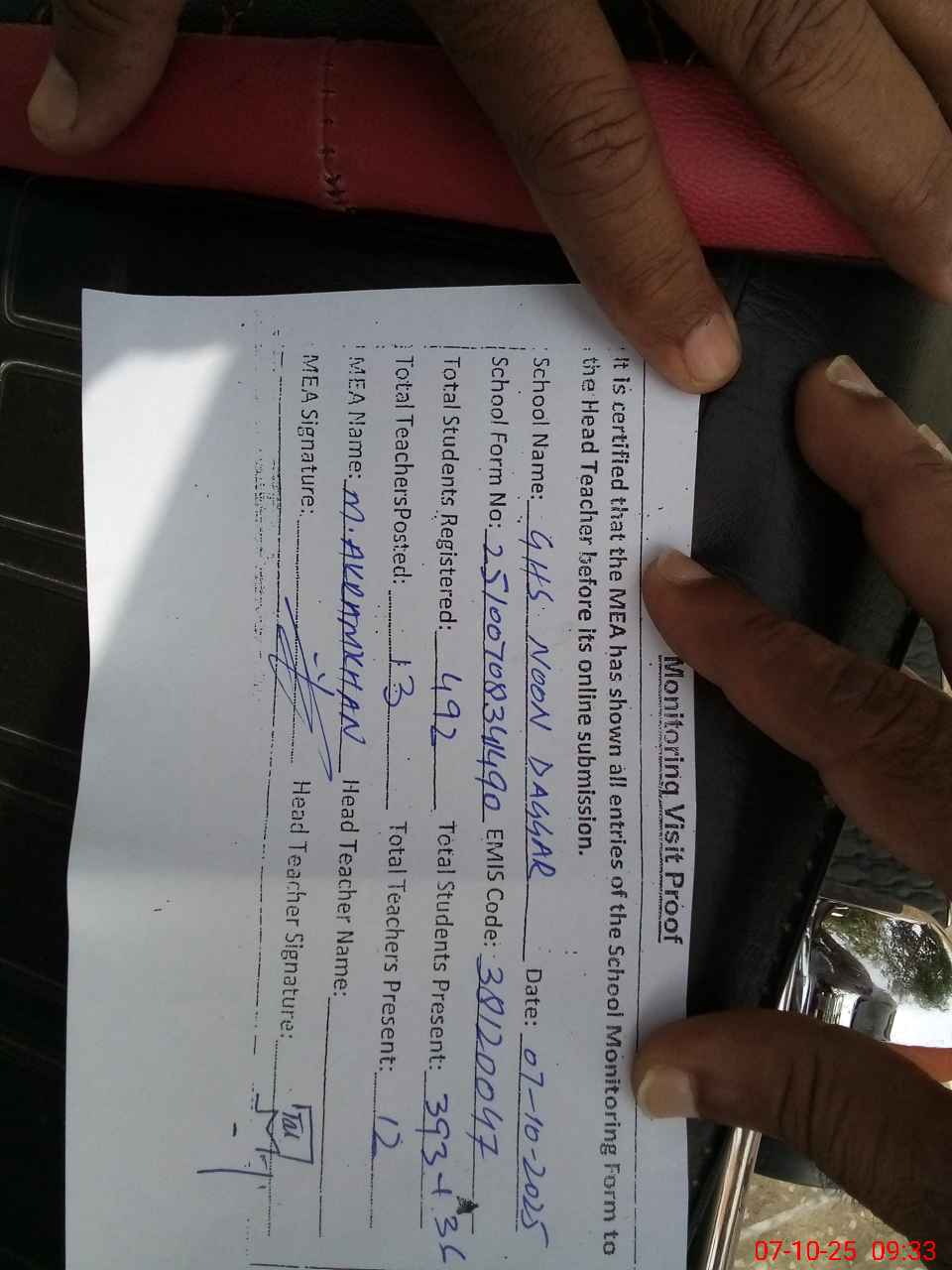 | Attendance Register | Head Teacher | MEA with School | Visit Proof |