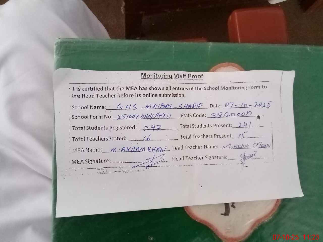 | Attendance Register | Head Teacher | MEA with School | Visit Proof |