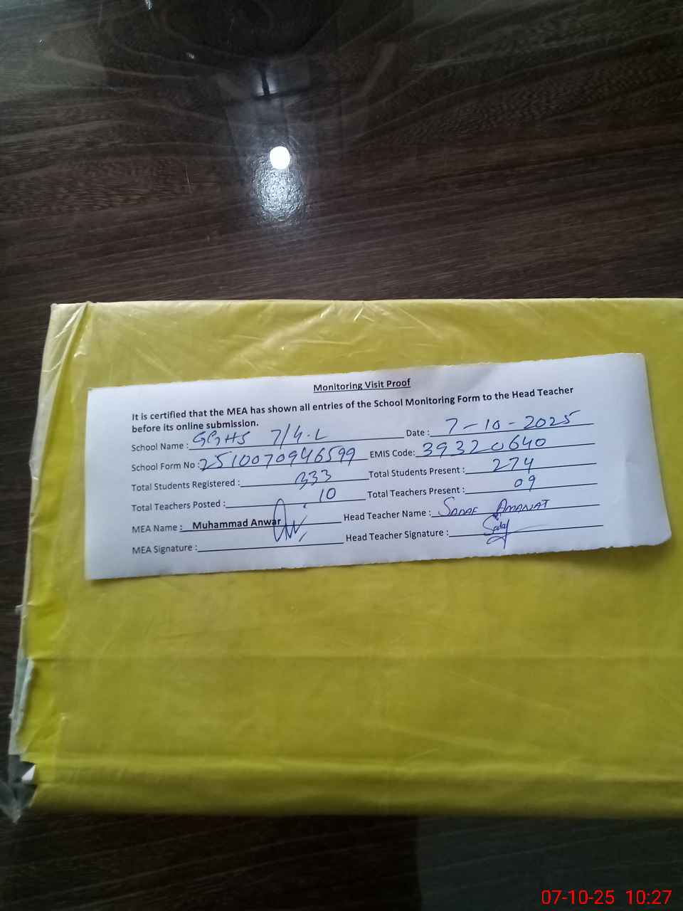 | Attendance Register | Head Teacher | MEA with School | Visit Proof |