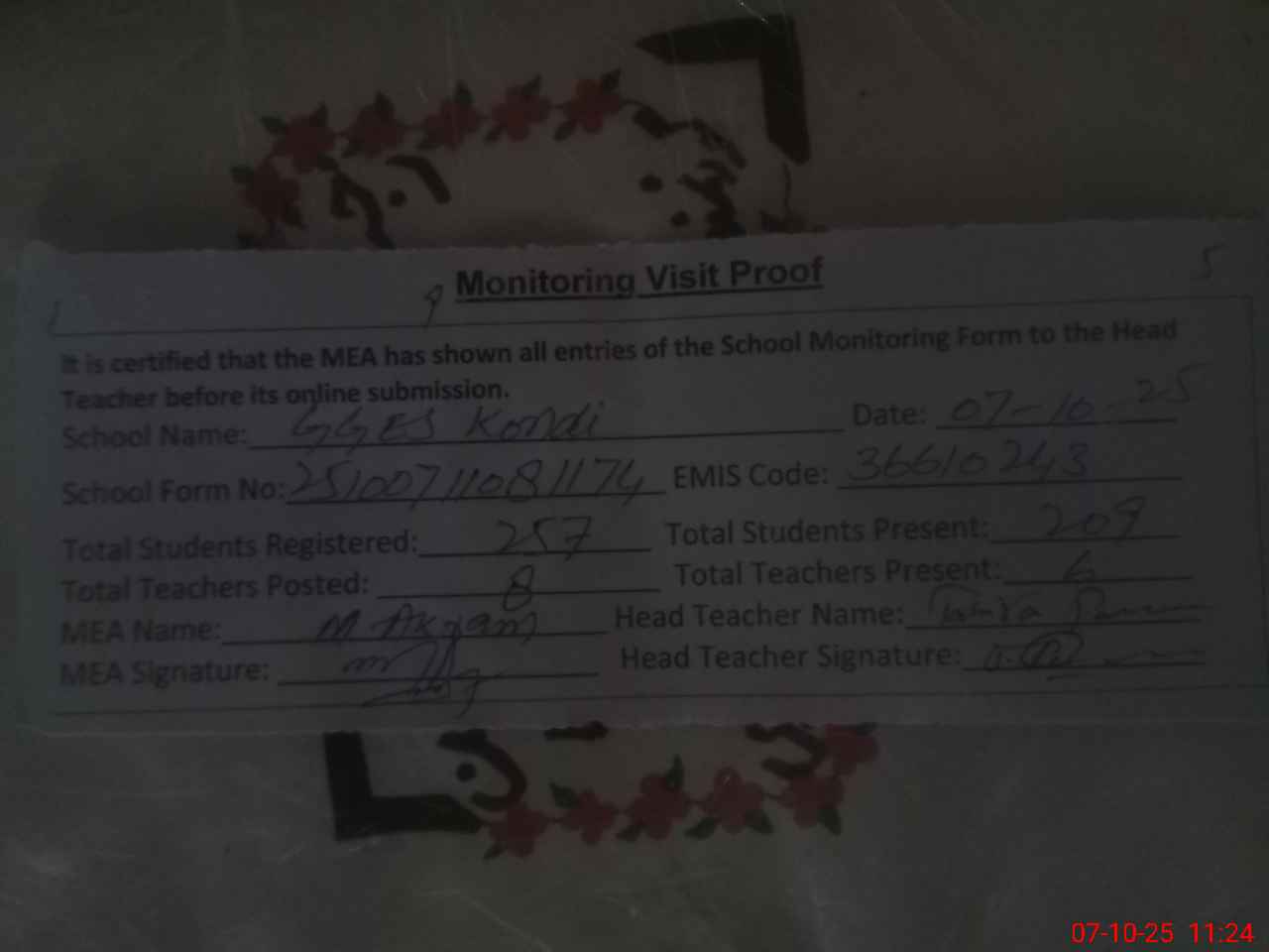 | Attendance Register | Head Teacher | MEA with School | Visit Proof |