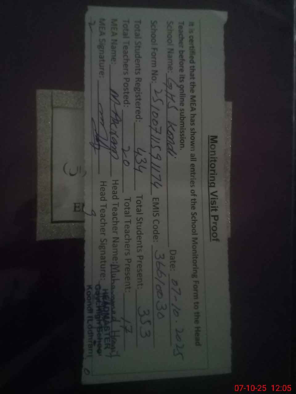 | Attendance Register | Head Teacher | MEA with School | Visit Proof |