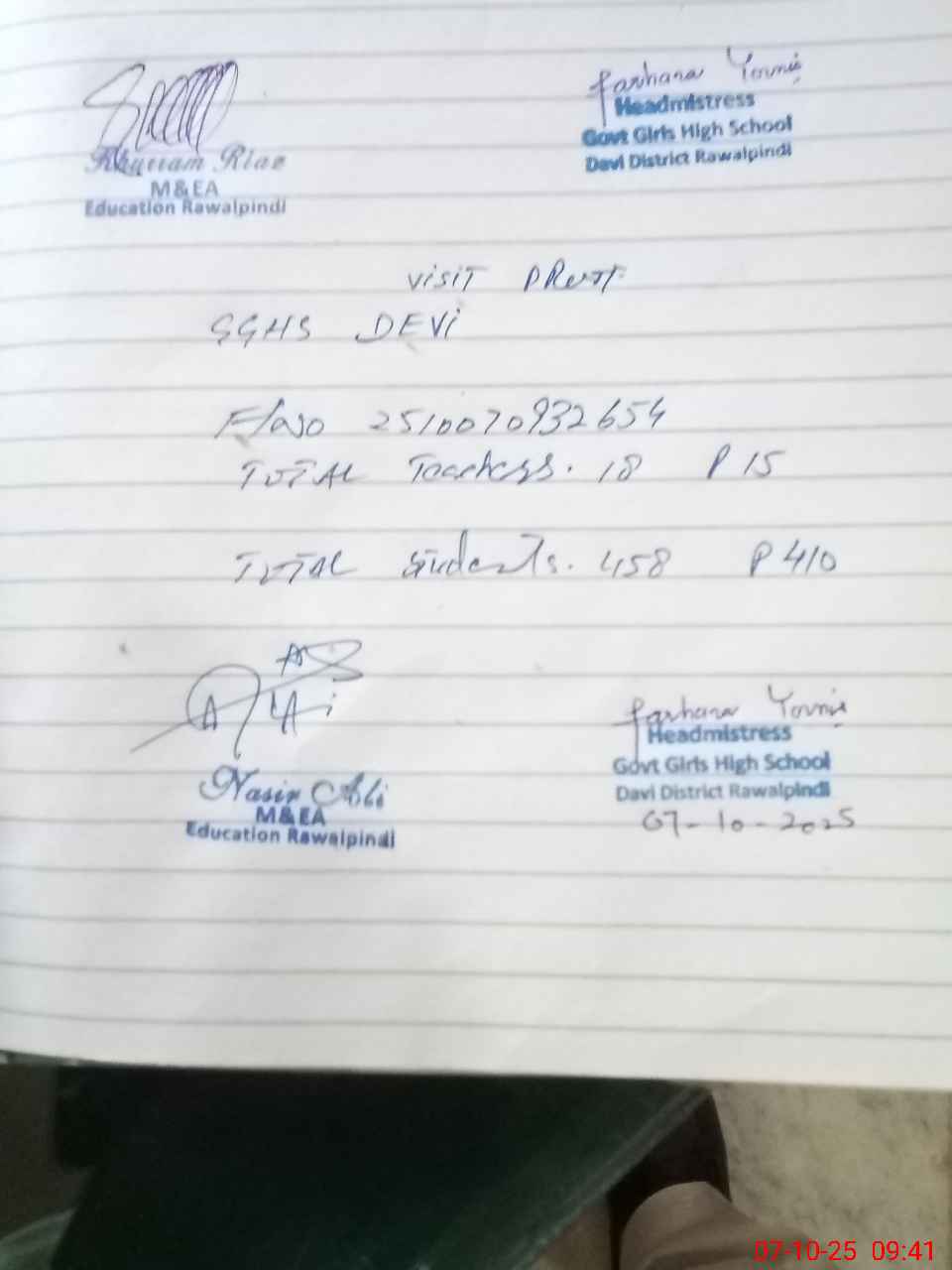 | Certified that this School was Inspected by the Undersigned MEA/DMO Today and the Information Stated Above is as Per Record. | |||||