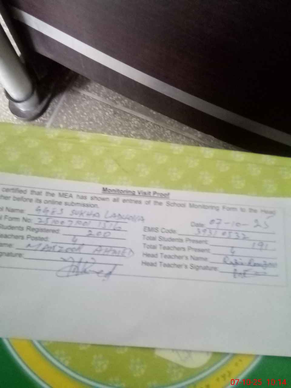 | Certified that this School was Inspected by the Undersigned MEA/DMO Today and the Information Stated Above is as Per Record. | |||||