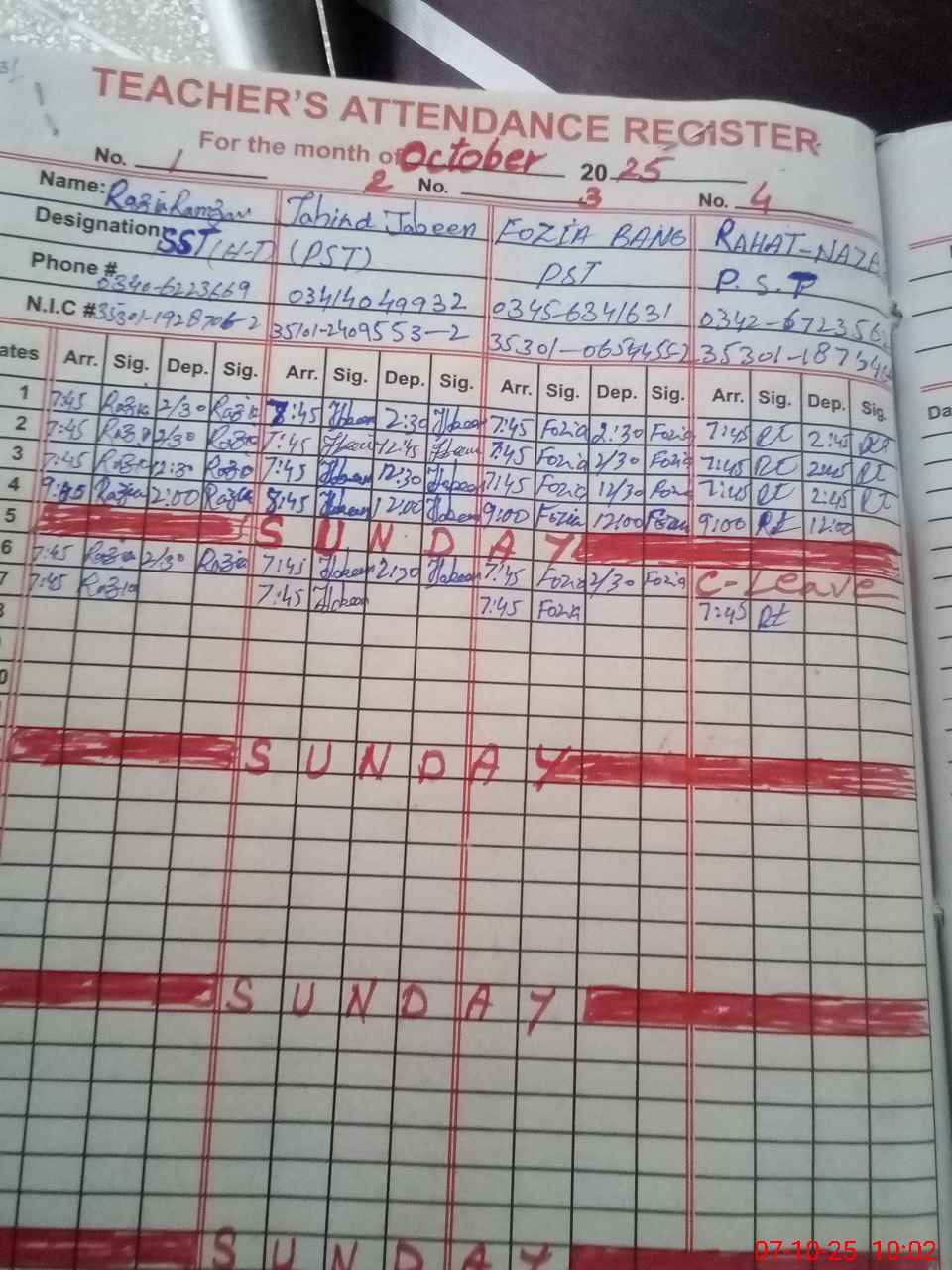 | CNIC | Full Name | Designation | R/C | Absence during last cal. month |